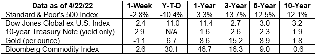 Last week, major U.S. stock indices declined, reported William Watts and Barbara Kollmeyer of MarketWatch, and the real yield* for 10-year U.S. Treasuries was briefly in positive territory for the first time since the pandemic began in 2020, reported Jacob Sonenshine of Barron’s.